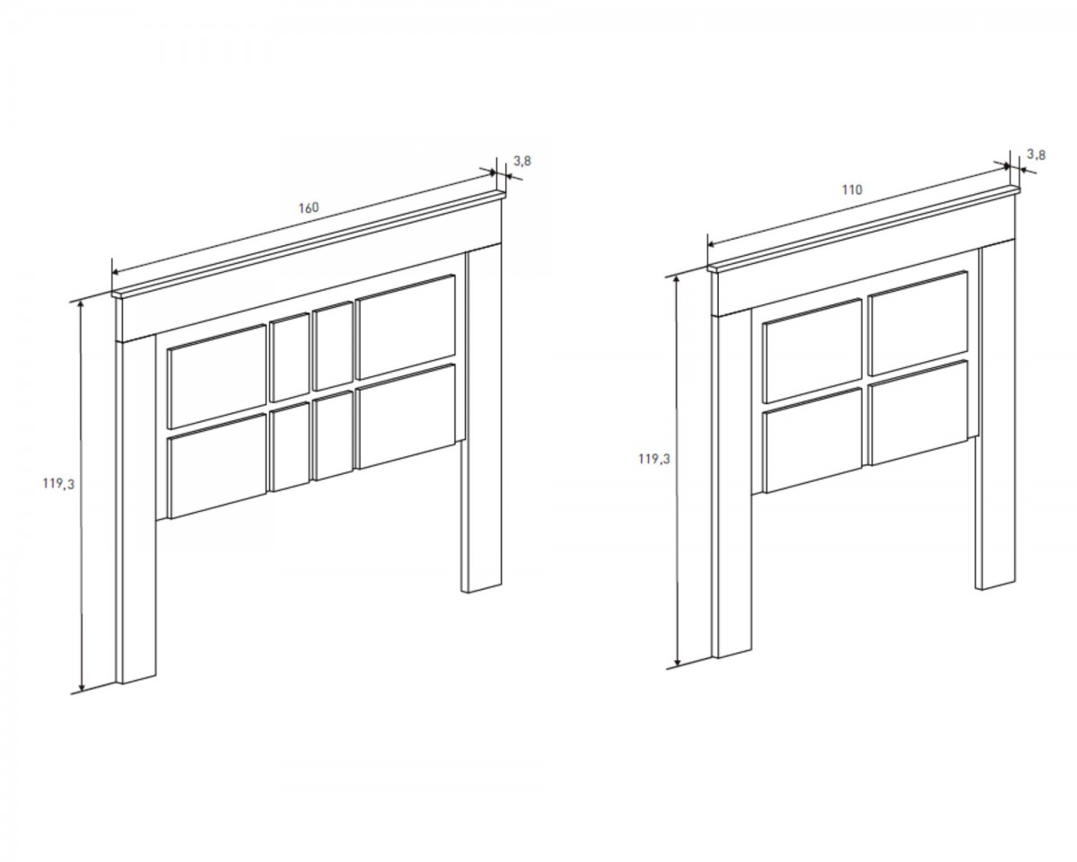 - Cabecero matrimonio: alto 119,3 cm, ancho 160 cm, fondo 3,8 cm.