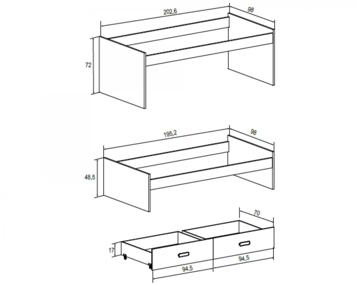 - Cama baja: alto 48,5 cm, ancho 195,2 cm, fondo 98 cm.