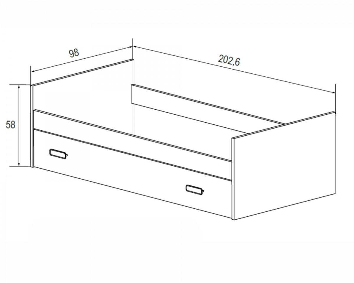 - Cama nido: alto 58 cm, ancho 202,6 cm, fondo 98 cm.