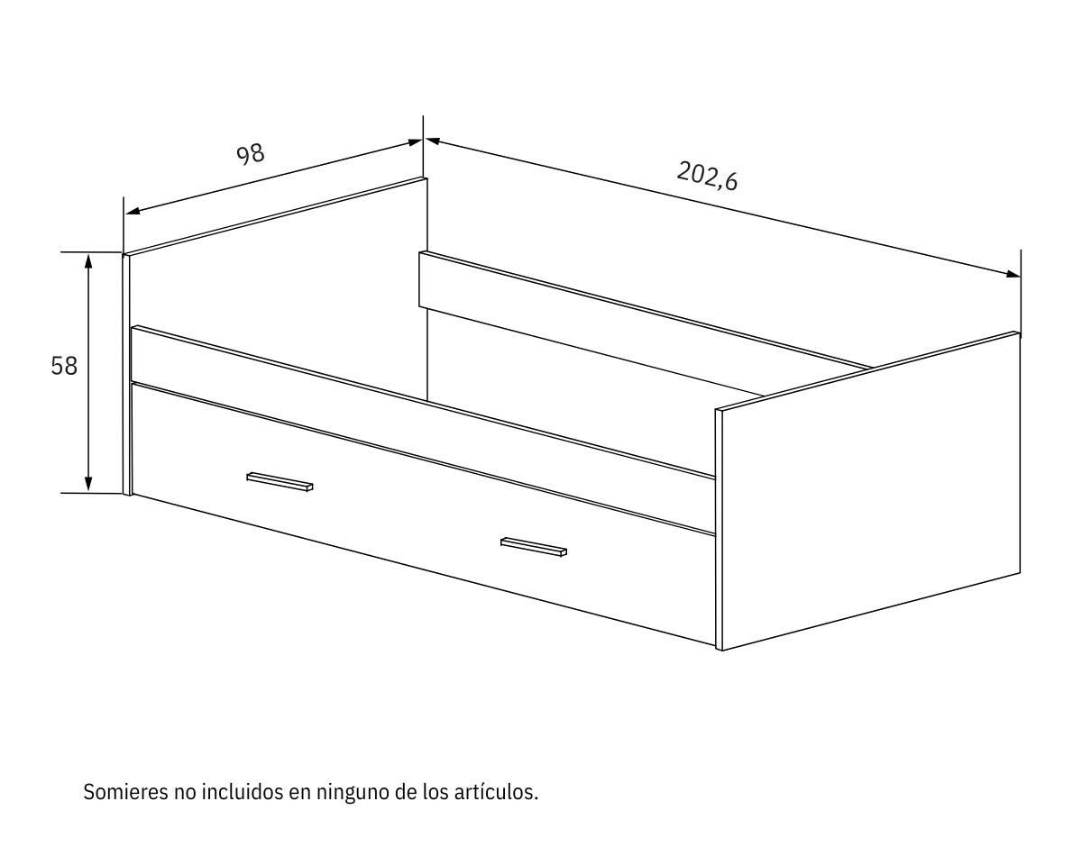 - Cama nido: alto 58 cm, ancho 202,6 cm, fondo 98 cm.
