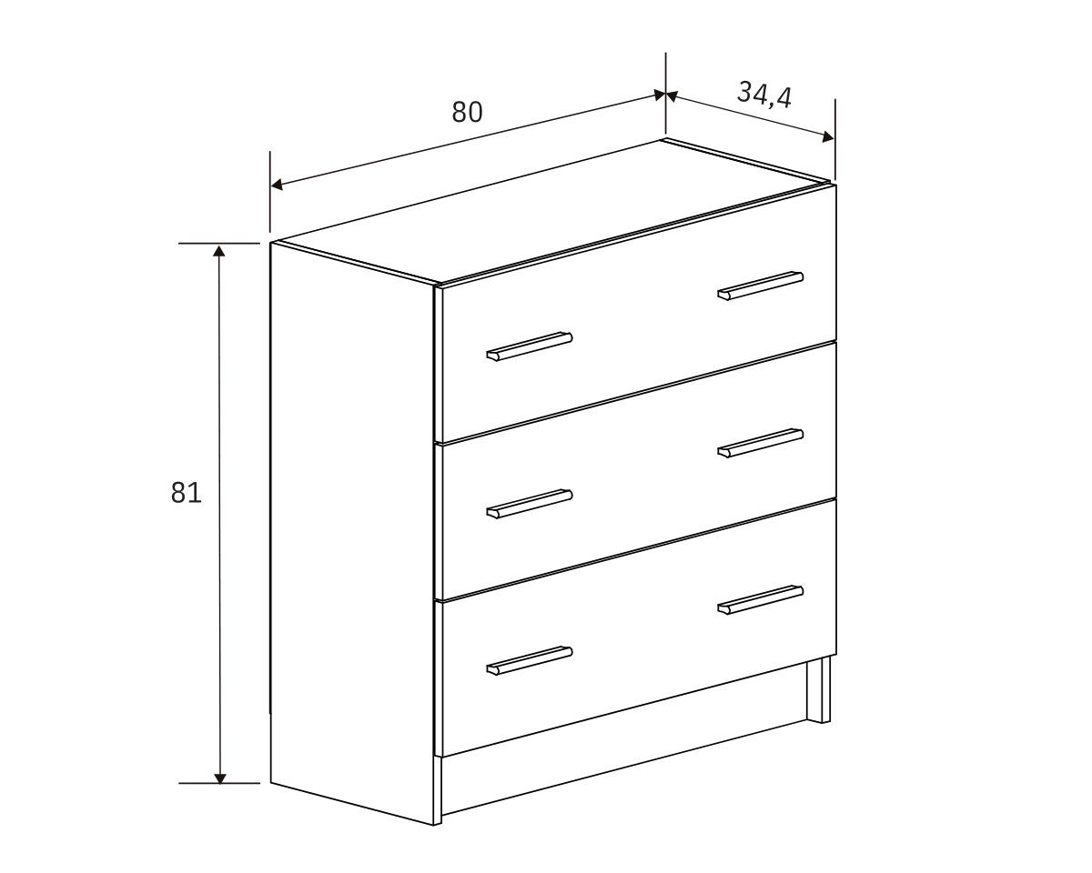 - Cómoda: alto 81 cm, ancho 84 cm, fondo 34,4 cm.