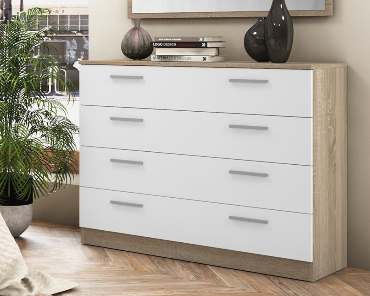 La cómoda MONIKA de cuatro cajones es uno de los complementos que combinan perfectamente con los dormitorios de su mismo nombre.
