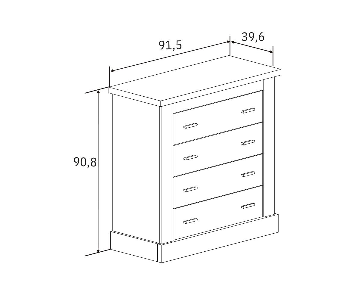 - Cómoda: alto 90,8 cm, ancho 91,5 cm, fondo 39,6 cm.