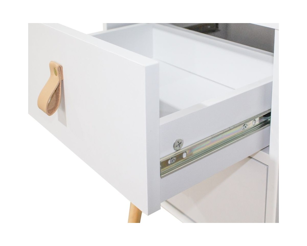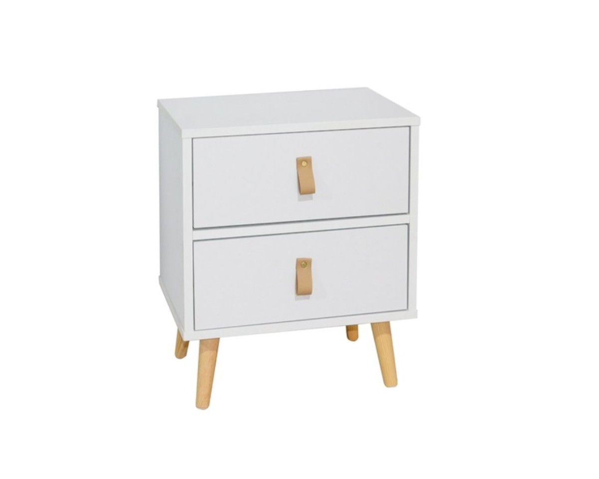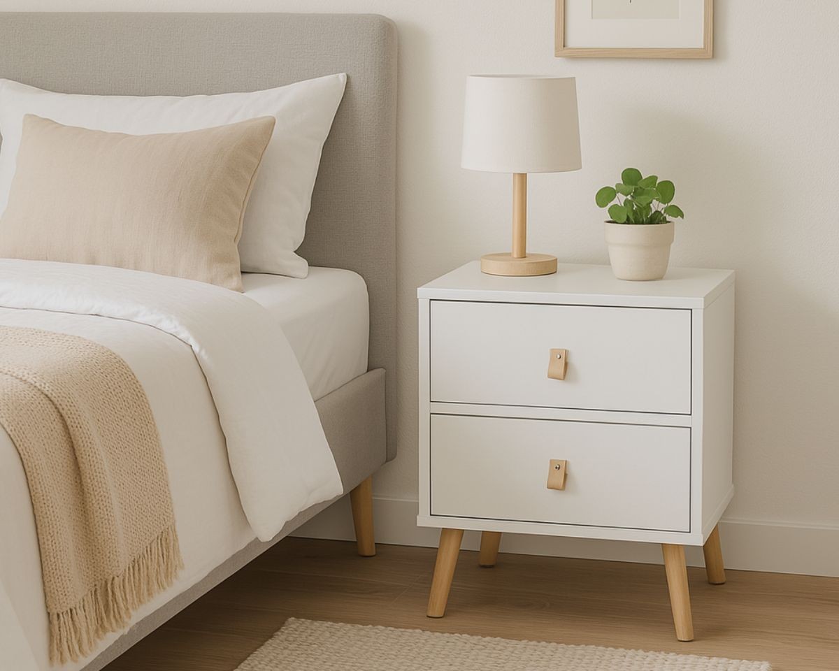 La Mesita Anzio Blanca 2 Cajones es un mueble compacto, moderno y muy práctico, ideal para dormitorios que buscan estilo y funcionalidad. Su acabado en melamina blanca aporta luminosidad y un diseño limpio, mientras que las patas de pino barnizado añaden un toque cálido y natural.