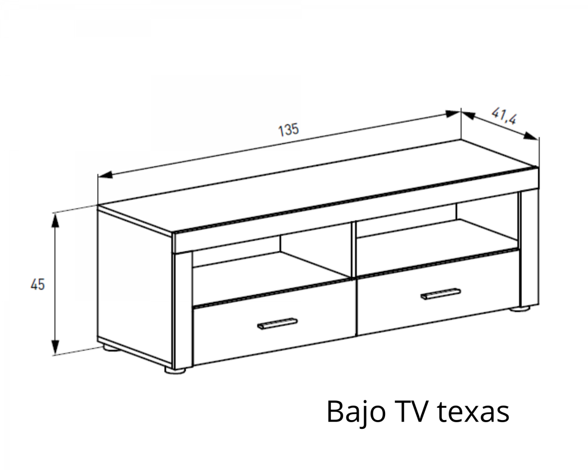- Bajo TV: alto 45 cm, ancho 135 cm, fondo 41,4 cm.