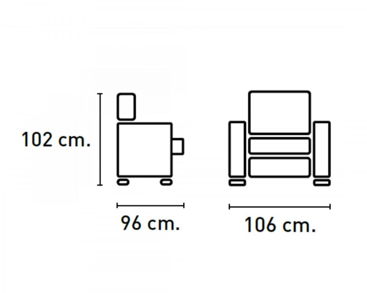 - Sillón: alto 102 cm, ancho 106 cm, fondo 96 cm.