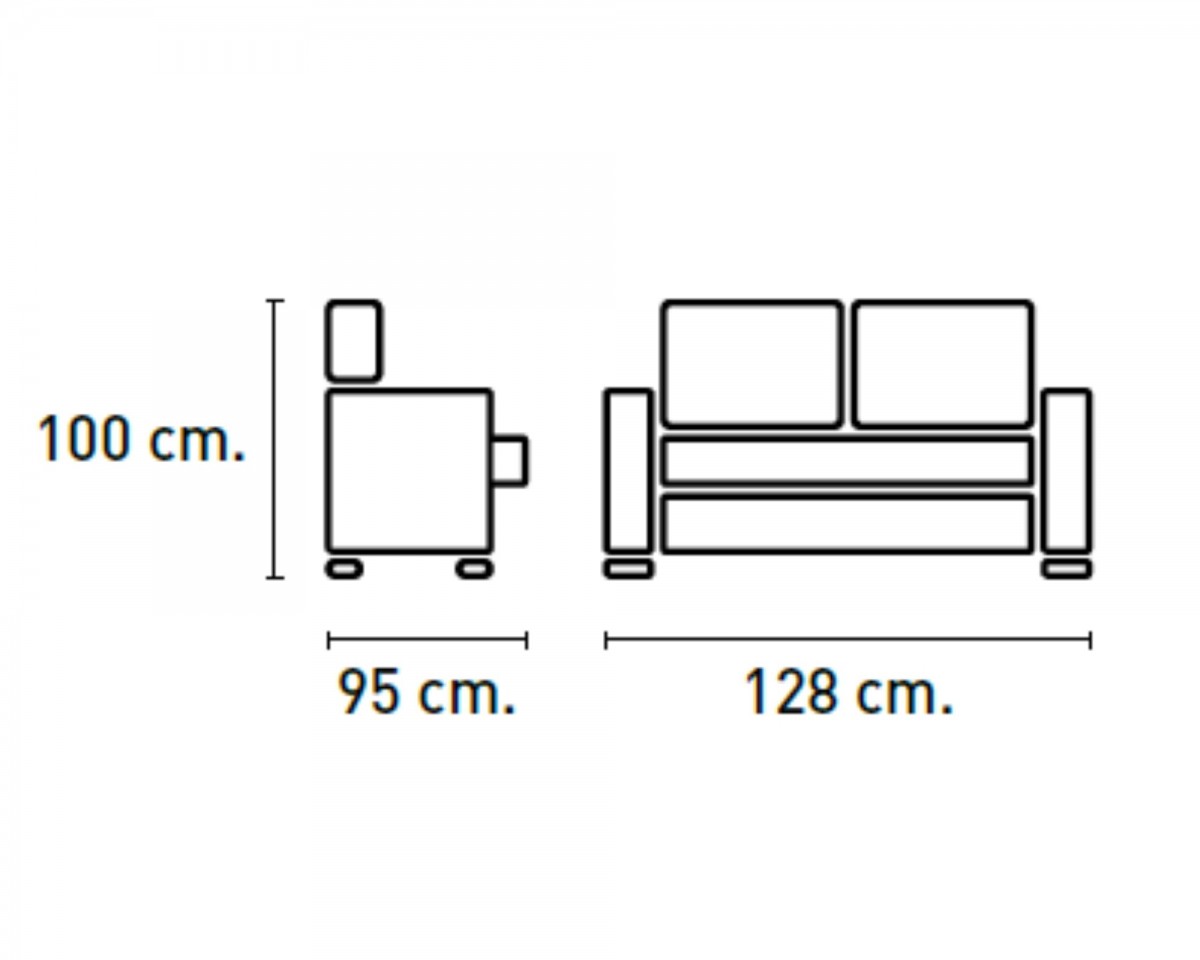- Sofá 2 pl: ancho 128 cm, fondo 95 cm y alto 100 cm.