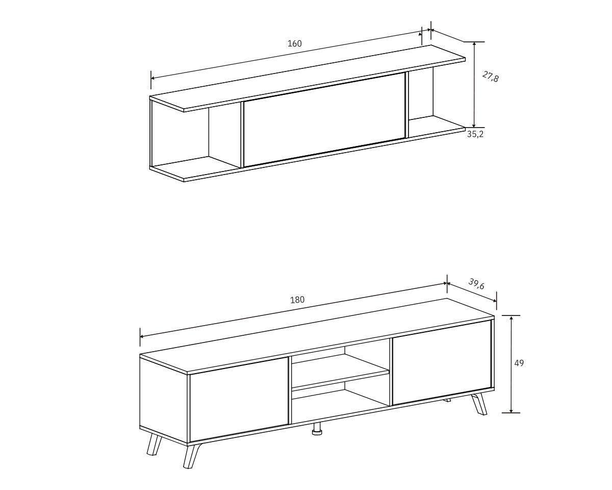 - Bajo TV: alto 49 cm, ancho 180 cm, fondo 39,6 cm.