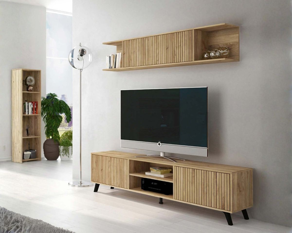La composición de salón SOLANA combina diseño moderno, gran capacidad y un acabado Mauvella Rayas muy actual. Incluye módulo alto y bajo TV.