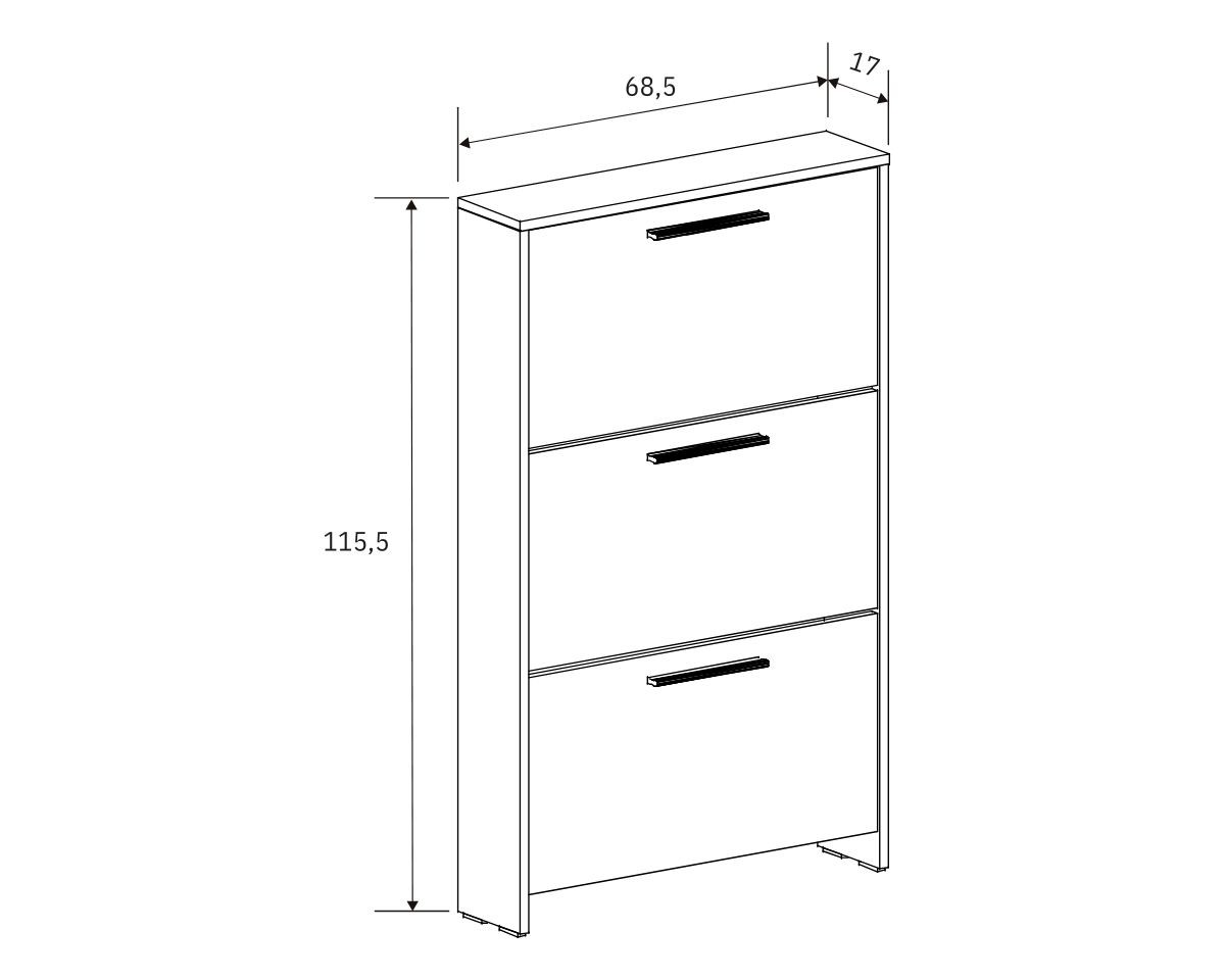 - Zapatero: alto 115,5 cm, ancho 68,5 cm, fondo 17 cm.