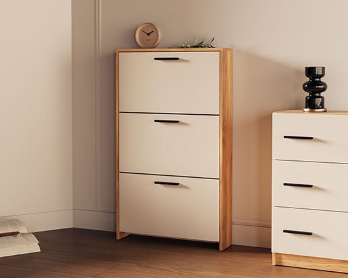 El Zapatero Elba de 3 Puertas con patas es la solución perfecta para mantener el orden en tu hogar con estilo. Su diseño moderno, líneas limpias y acabado en tonos naturales lo convierten en un mueble funcional y decorativo ideal para entradas, dormitorios o vestidores.